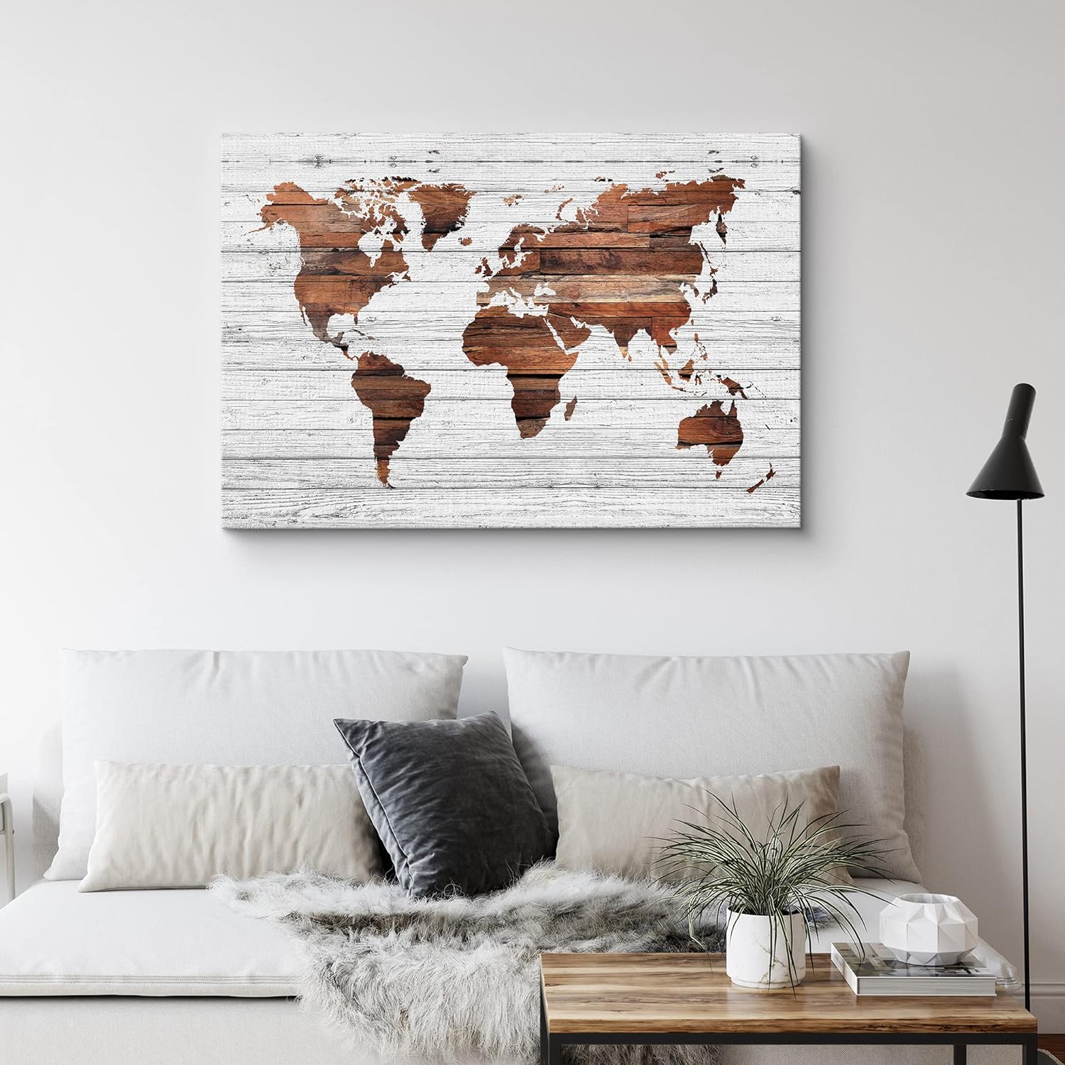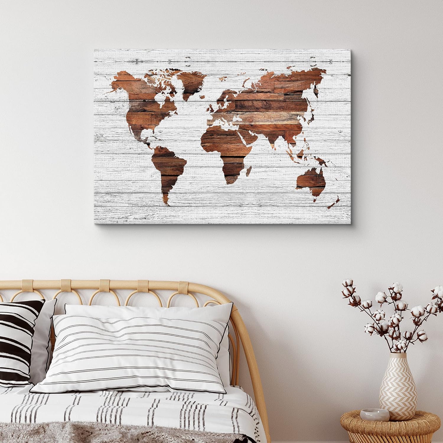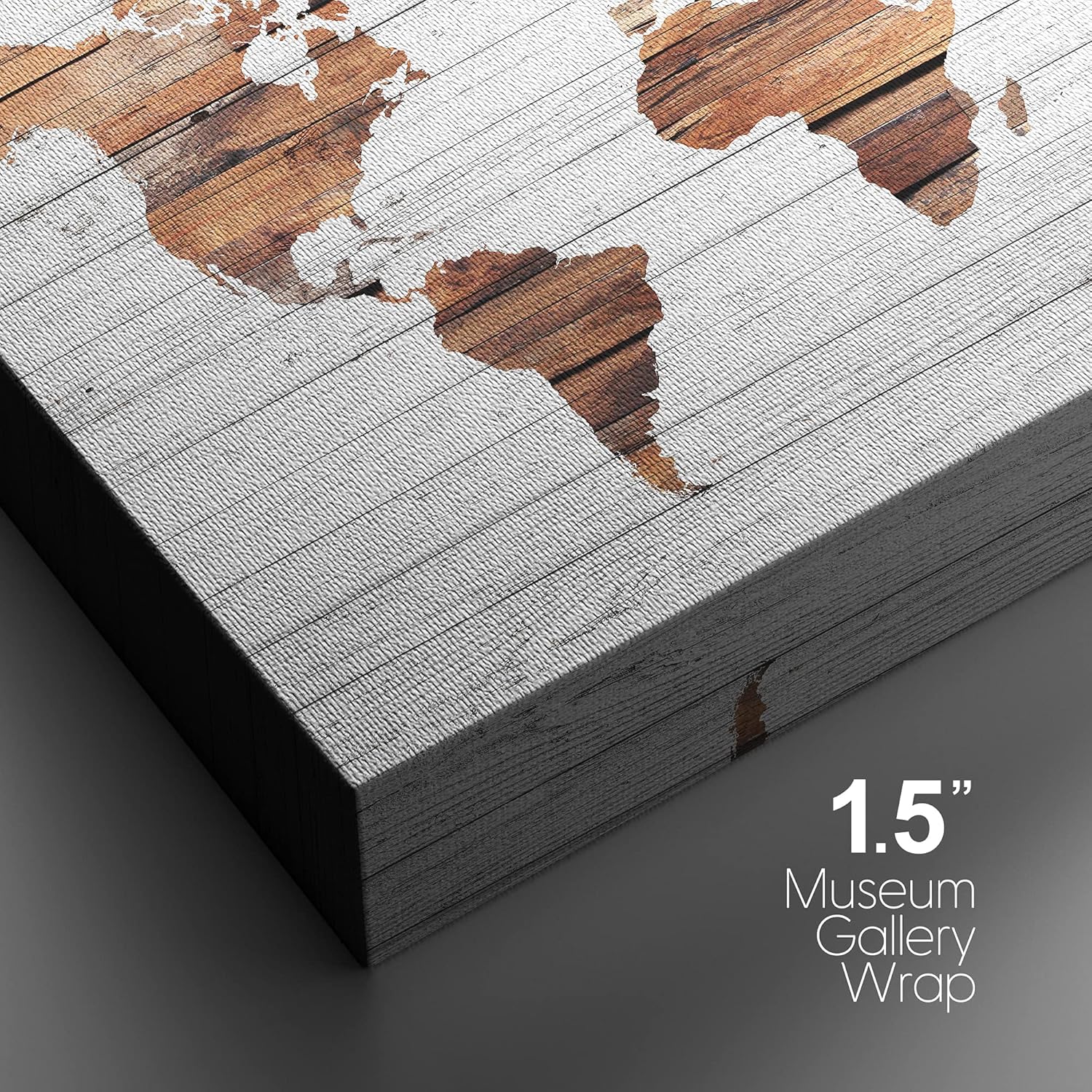 IDEA4WALL Canvas Wall Art Brown World Atlas Map on White Wood Panel Places Country Mixed Media Realism Global Urban for Living Room Bedroom Office