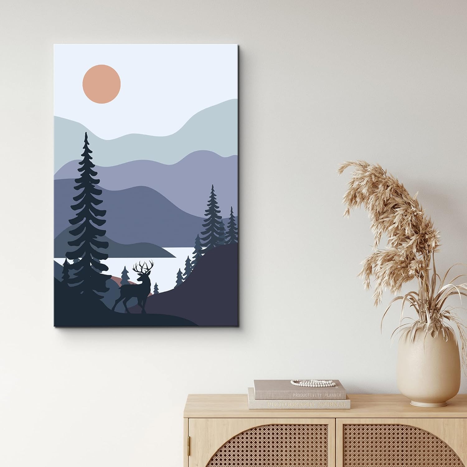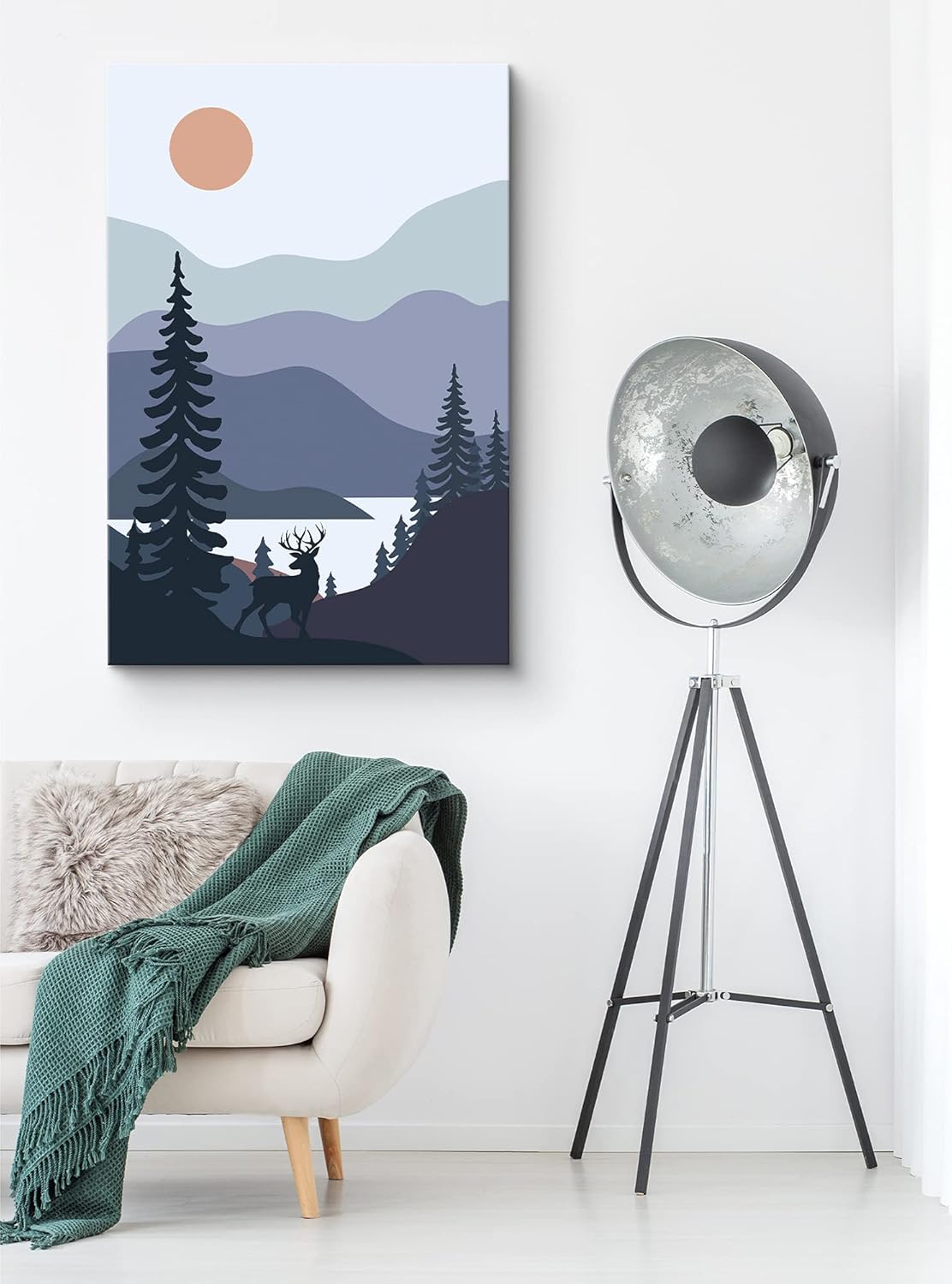 IDEA4WALL Canvas Wall Art Deer with Purple Gray Mountain Orange Sun and Purple Forest and Lake Nature Wilderness Illustrations Minimalism Modern Scenic for Living Room Bedroom Office inches