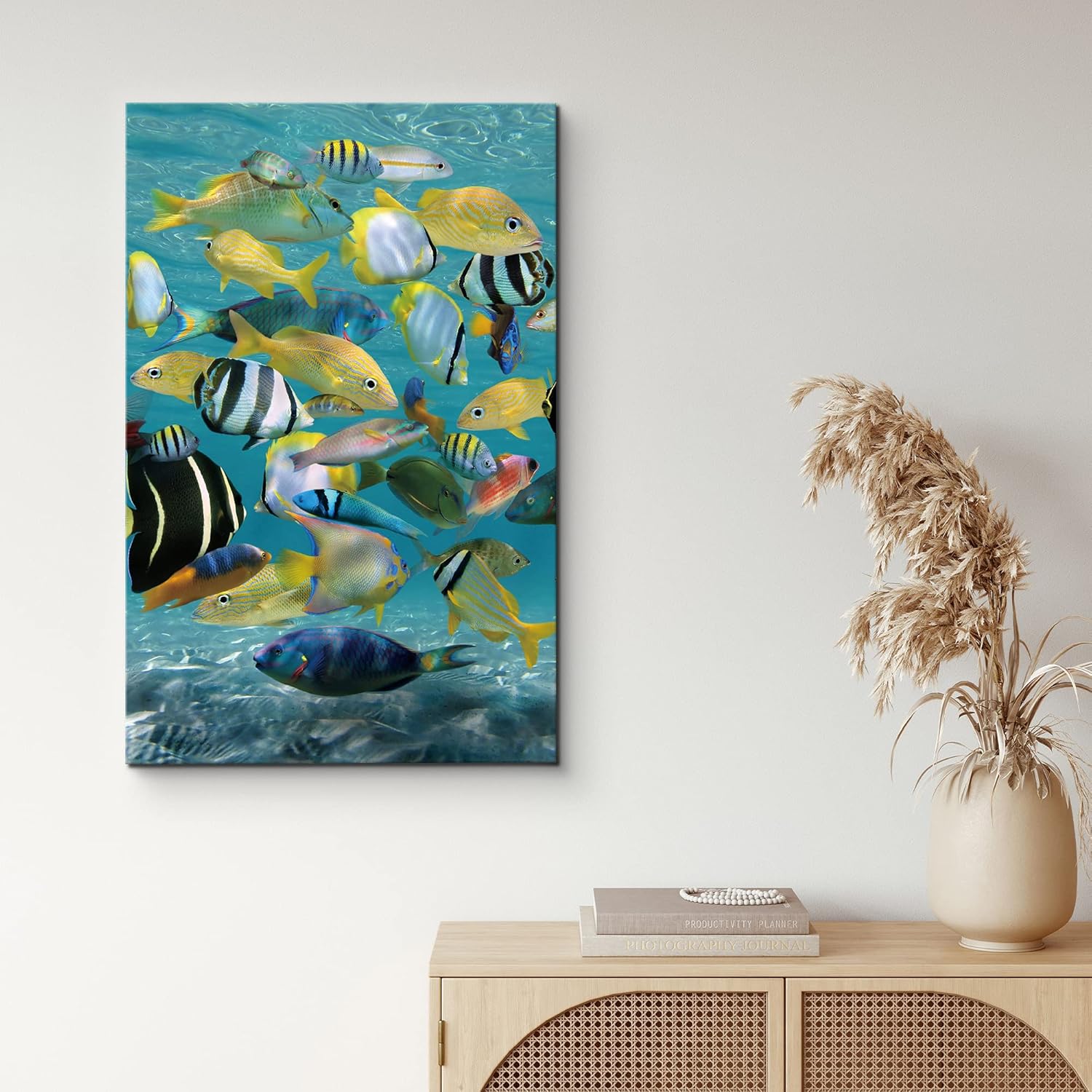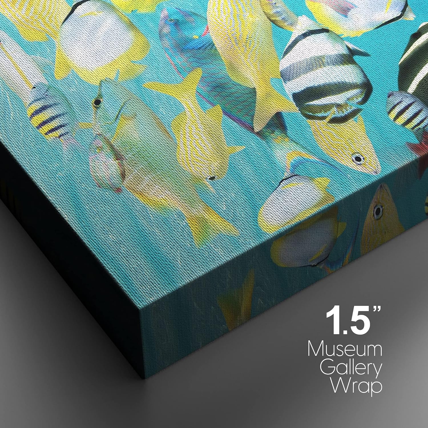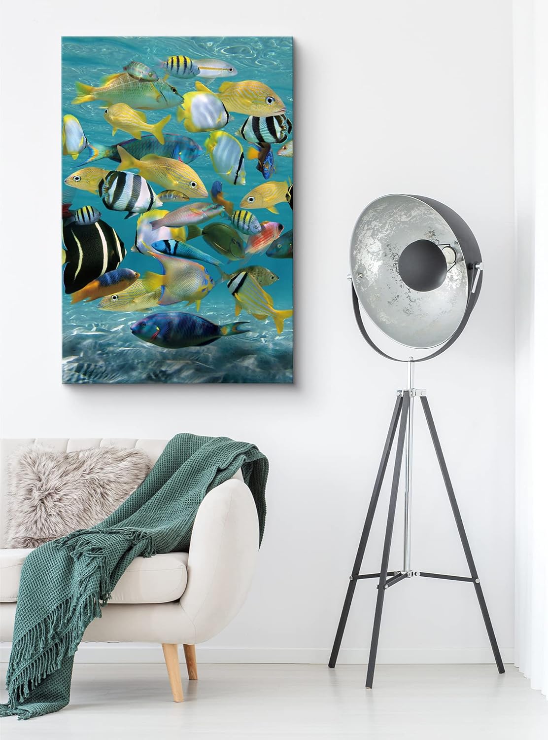 IDEA4WALL Canvas Wall Art School of Sliver Blue Yellow Coral Reef Fish Swimming Under The Sea Marine Life Ocean Photography Realism Nautical Scenic for Living Room Bedroom Office inches