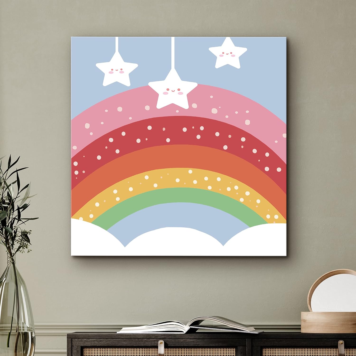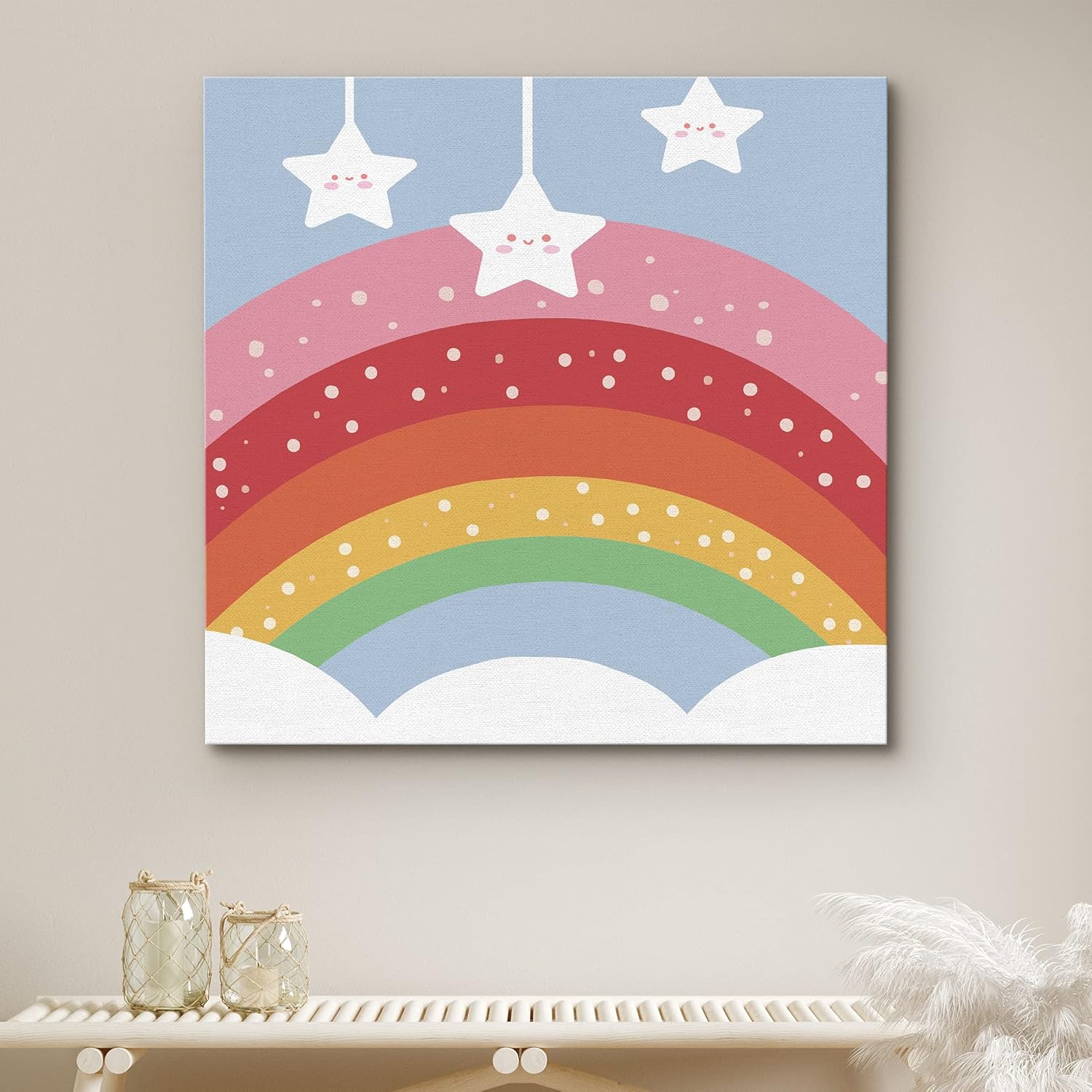 IDEA4WALL Canvas Print Wall Art White Stars Hover Above Rainbow in Clouds Geometric Shapes Illustrations Modern Art Chic Relax Calm Multicolor Warm for Living Room Bedroom Office