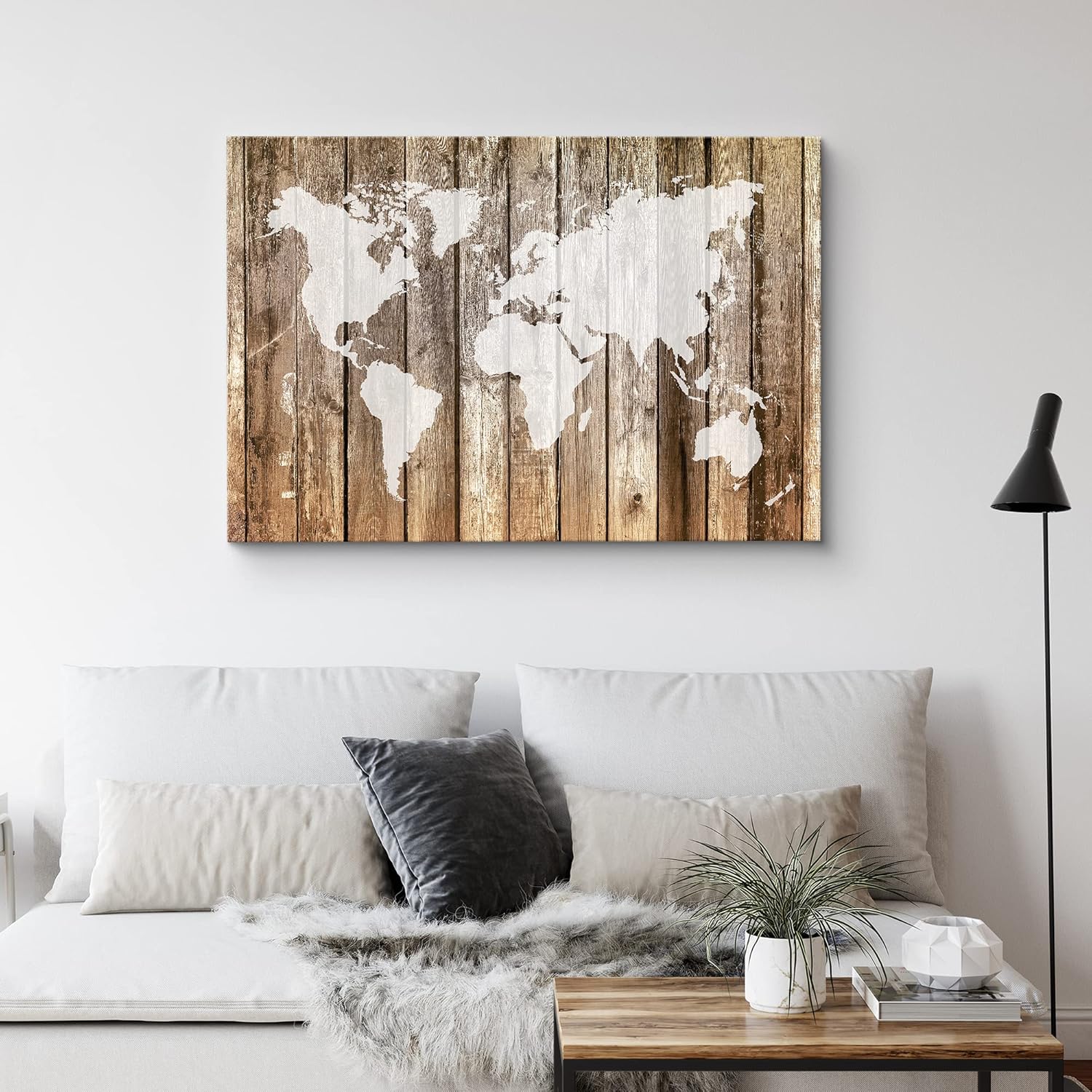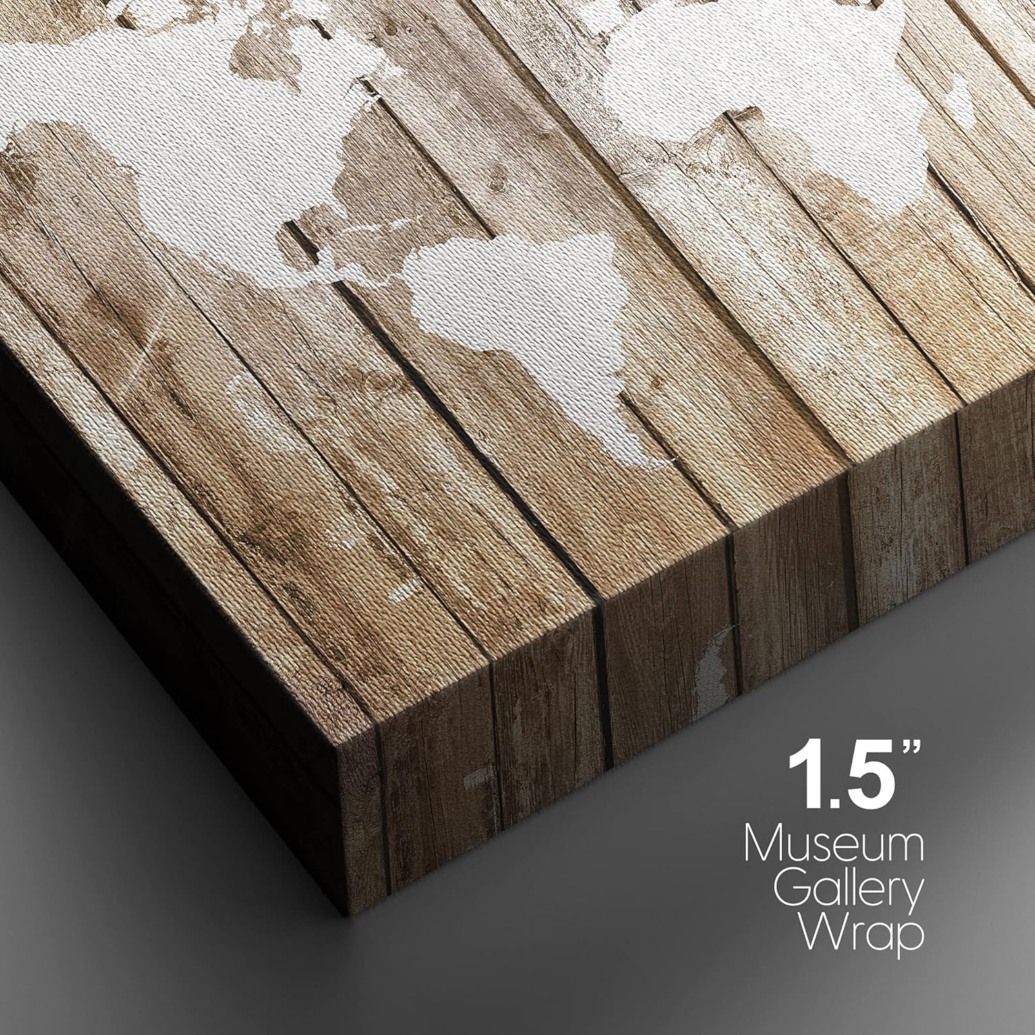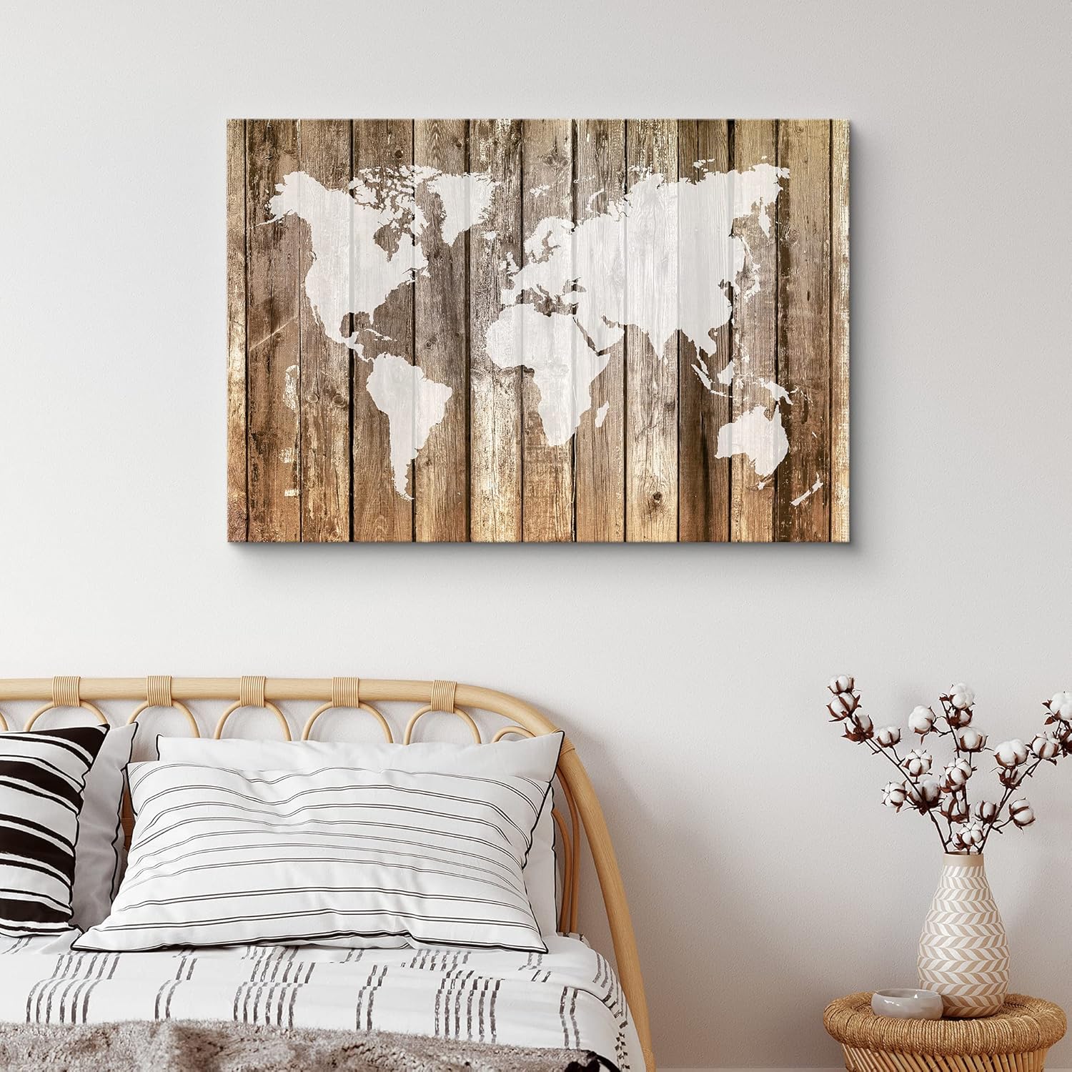 IDEA4WALL Canvas Wall Art White World Atlas Map on Brown Wood Panel Places Country Mixed Media Realism Global Urban for Living Room Bedroom Office